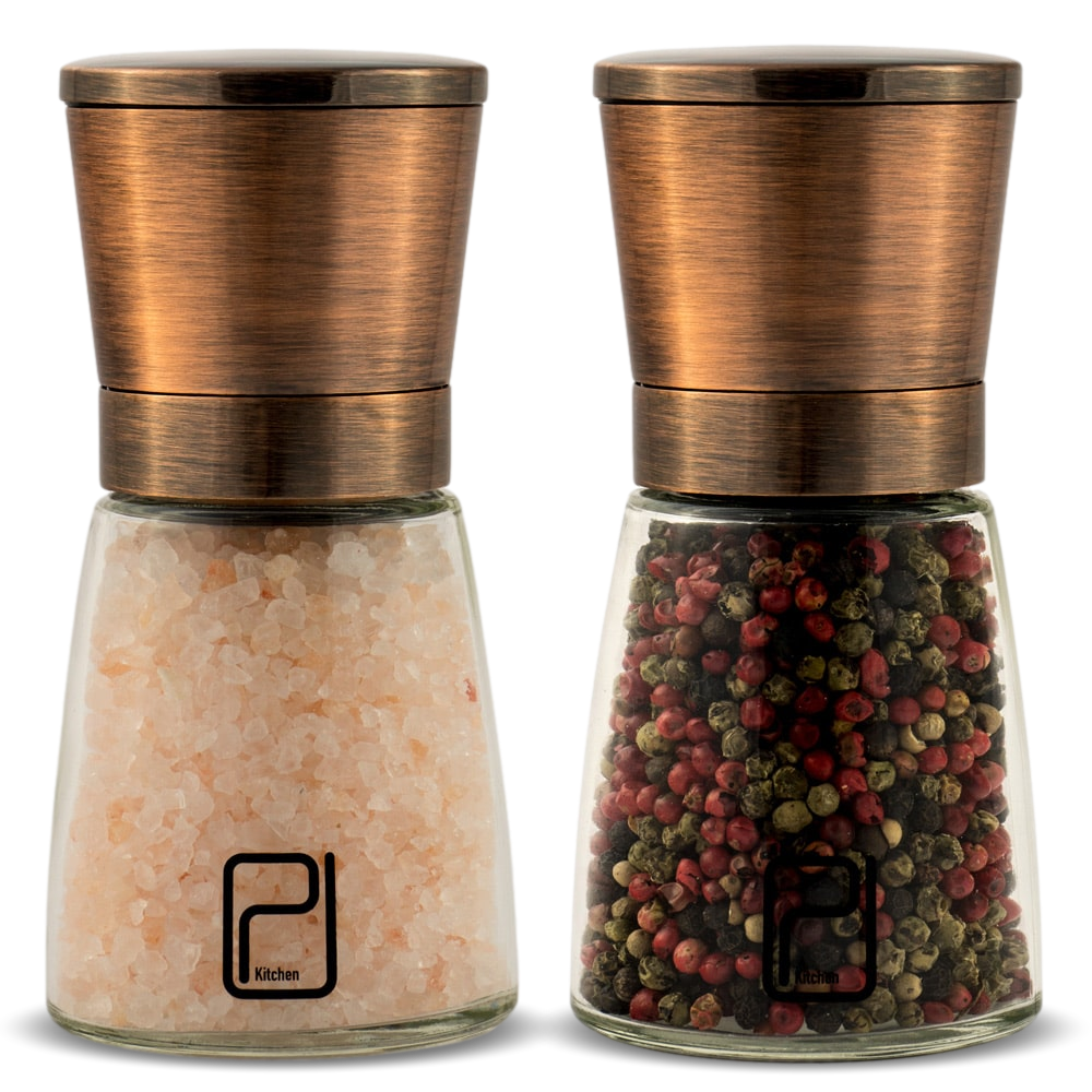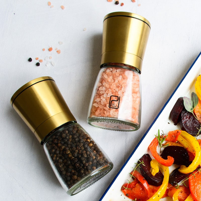 - ✅ PREMIUM QUALITY - Are you tired of searching a stylish, good quality salt and pepper grinder set? Congratulations, you found it! This is the quality you are looking for. Unlike most brands, only high quality materials are used. DURABLE lead free glass jars, high grade STAINLESS STEEL with GOLDEN finishing: electroplated - not some cheap paint finish. Excellent non-corrosive CERAMIC GRINDER, re-enforced grinder housing. If you want the best salt grinder and pepper mill, this set is for you.